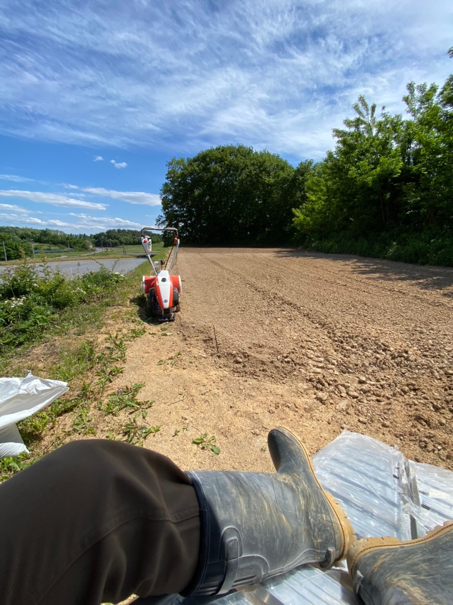 マルチ作業を行い、種から育てたえごまの苗を定植しました。
